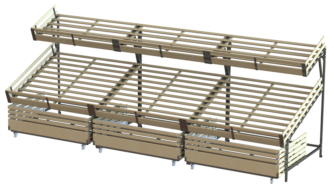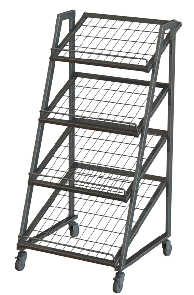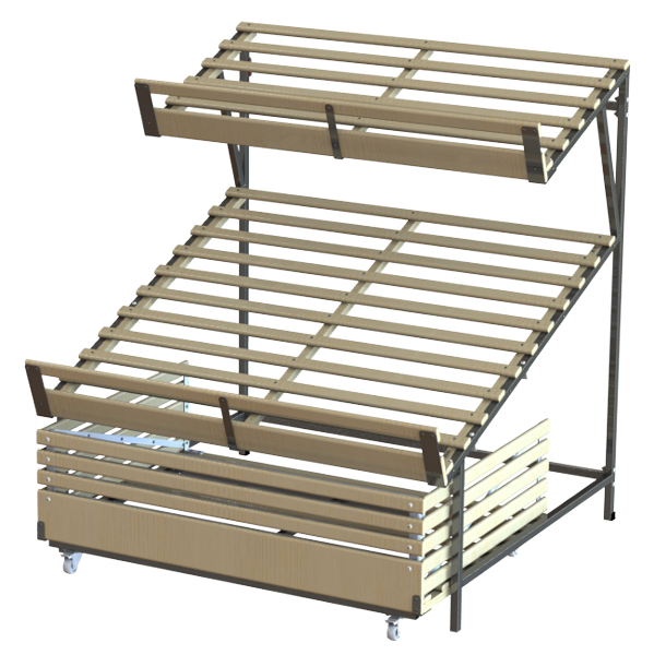 Stands for fruits and vegetables (type 7) is made of metal with wooden slats. The stand has two display levels and a lower roll-out shelf that allows you to make the rack three-level.