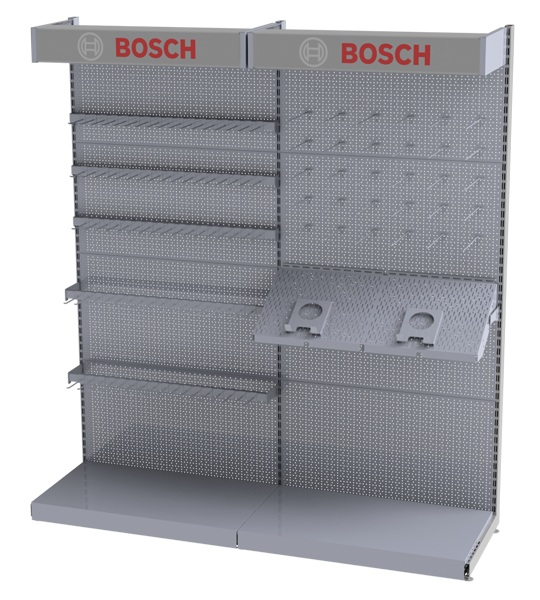 Wall racks for BOSCH in a corporate style with specialized accessories.