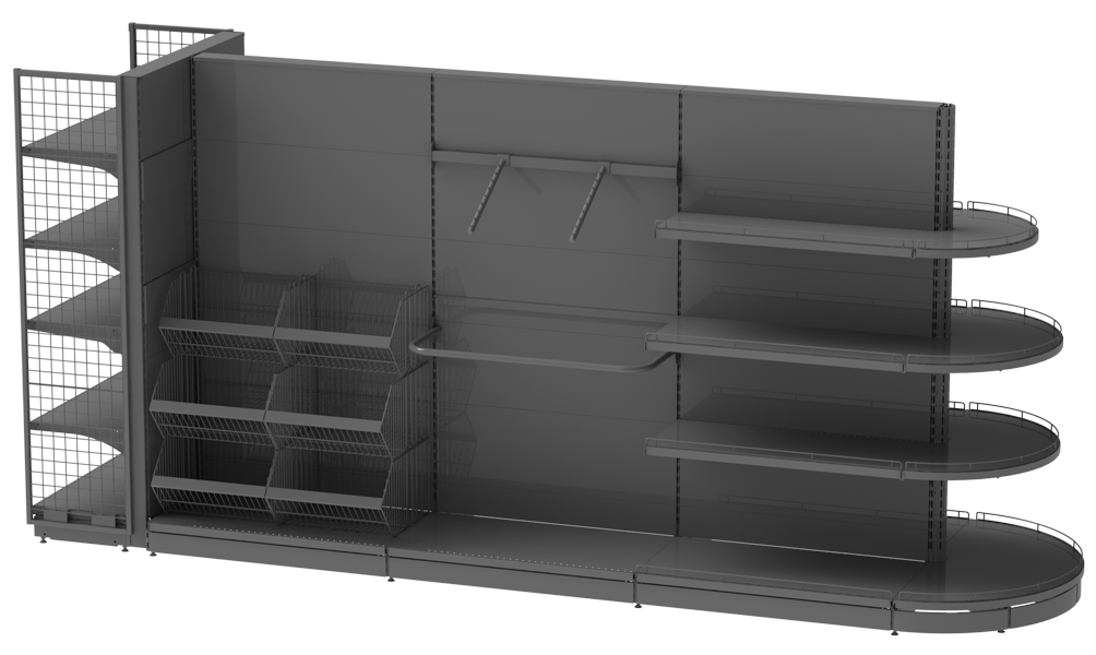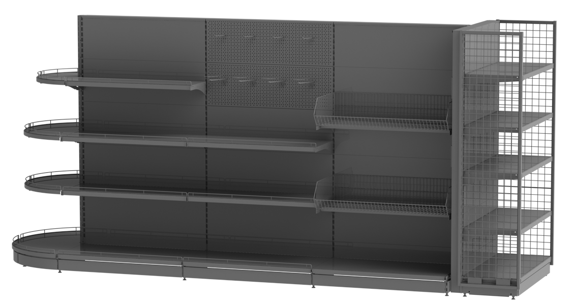 We offer wall-mounted racks, island racks, end racks, end semicircular racks, internal and external corners racks (angle 90 ° and 45 °). Shelves can be equipped with lighting.
