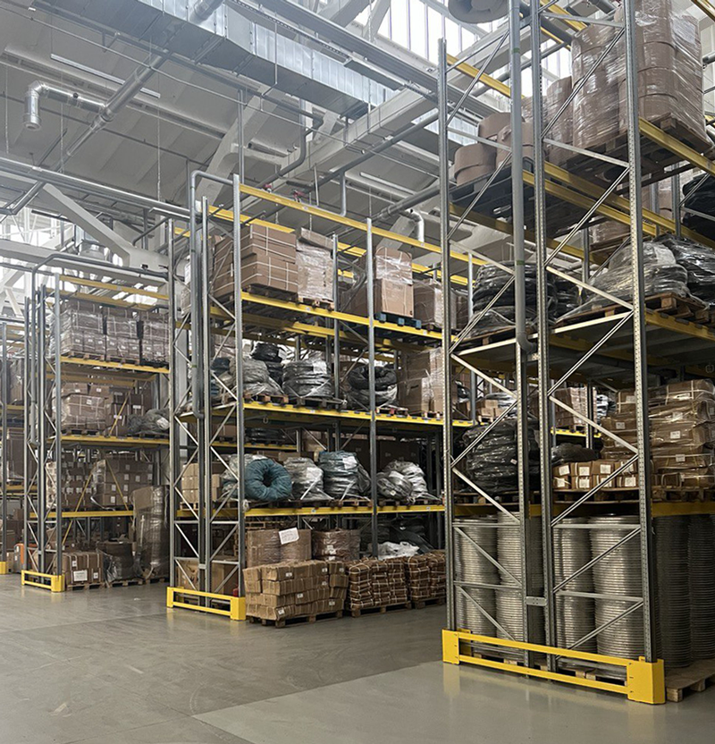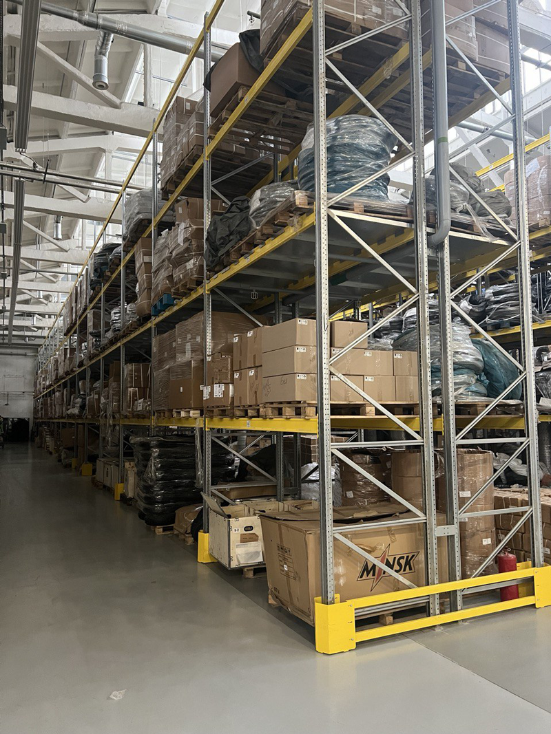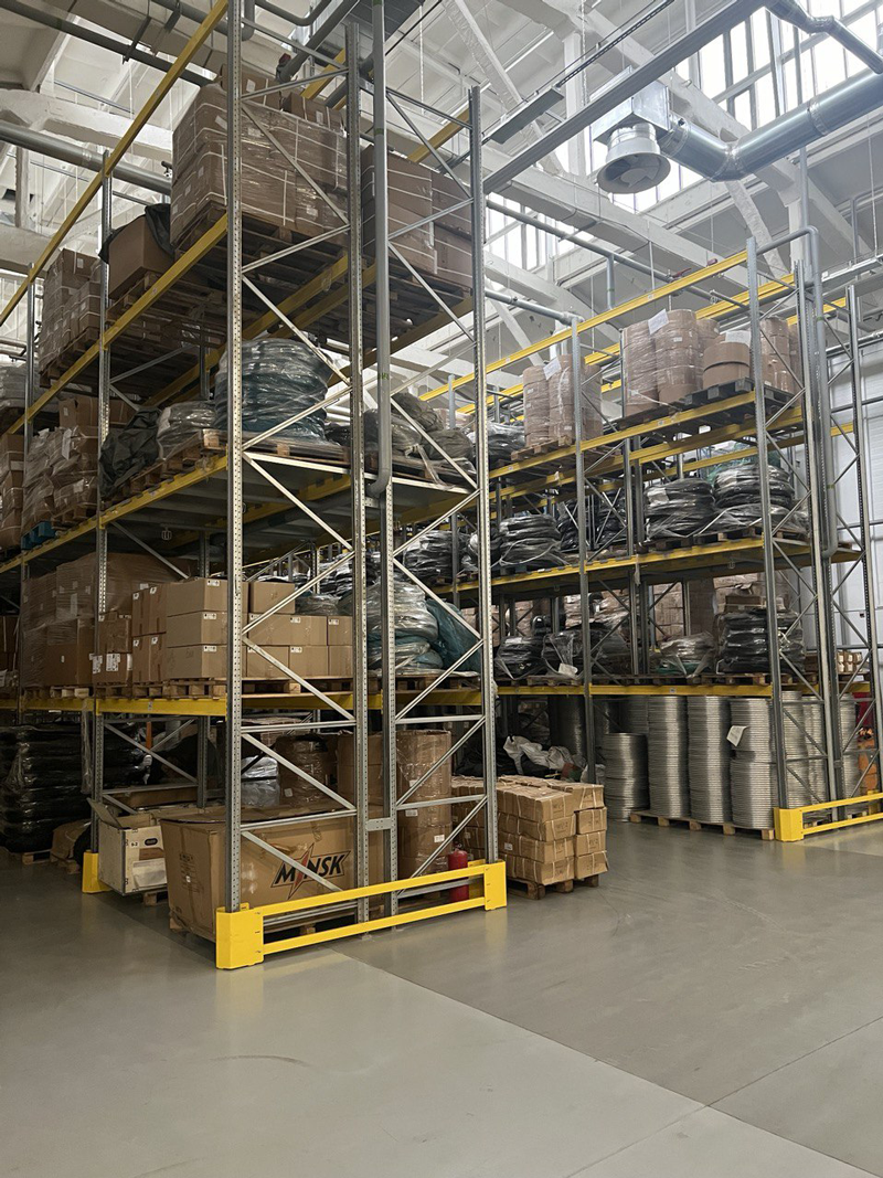 Материалы для изготовления стеллажей мы тщательно прорабатывали с клиентом. На данном объекте рамы фронтальных складских стеллажей выполнены из оцинкованной стали, а траверсы и защита (отбойники и бамперы) покрыты полимерным покрытием, легкие складские стеллажи выполнены в полимерном покрытии.