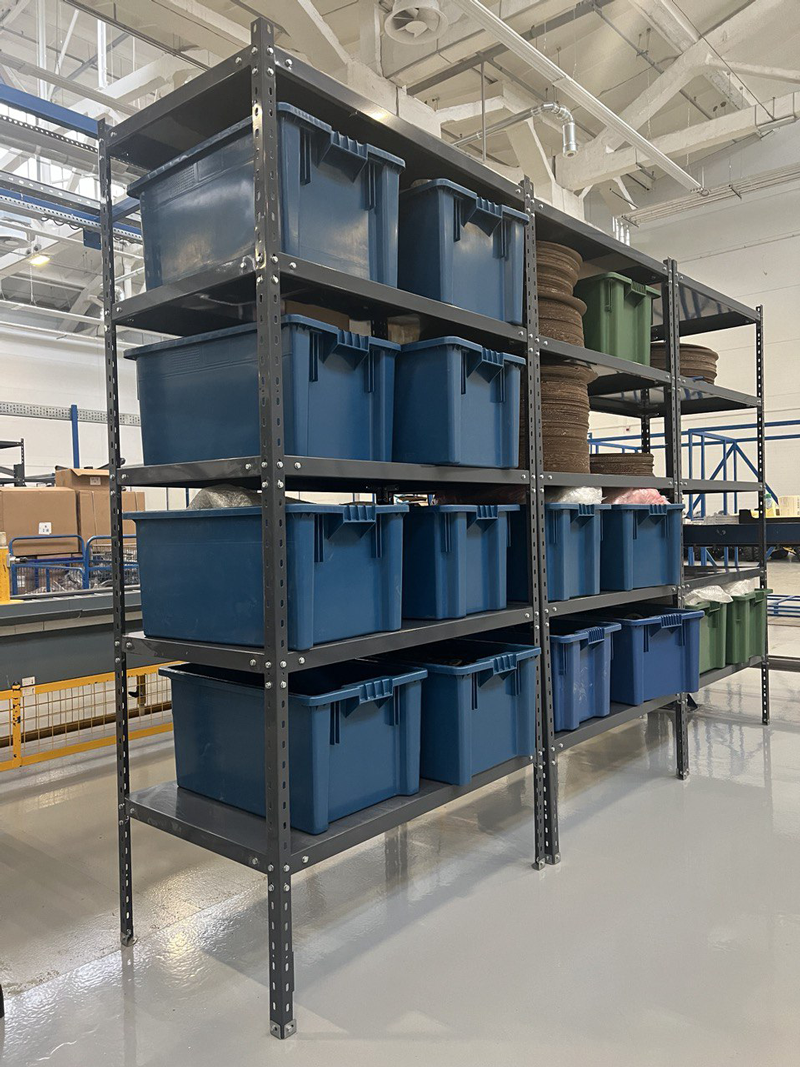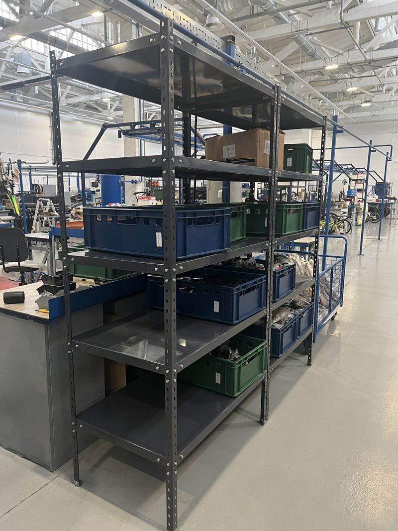 В связи с такой потребностью на объекте присутствуют как фронтальные стеллажи для более объемных полуфабрикатов и материалов, так и лёгкие - для мелкоштучной продукции.
