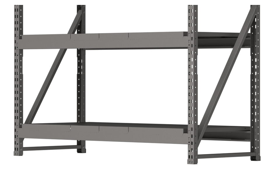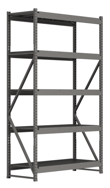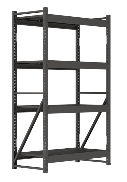 Рама стеллажа представляет собой сборную конструкцию. К вертикальным стойкам крепятся горизонтальные и диагональные стяжки болтовым соединением.